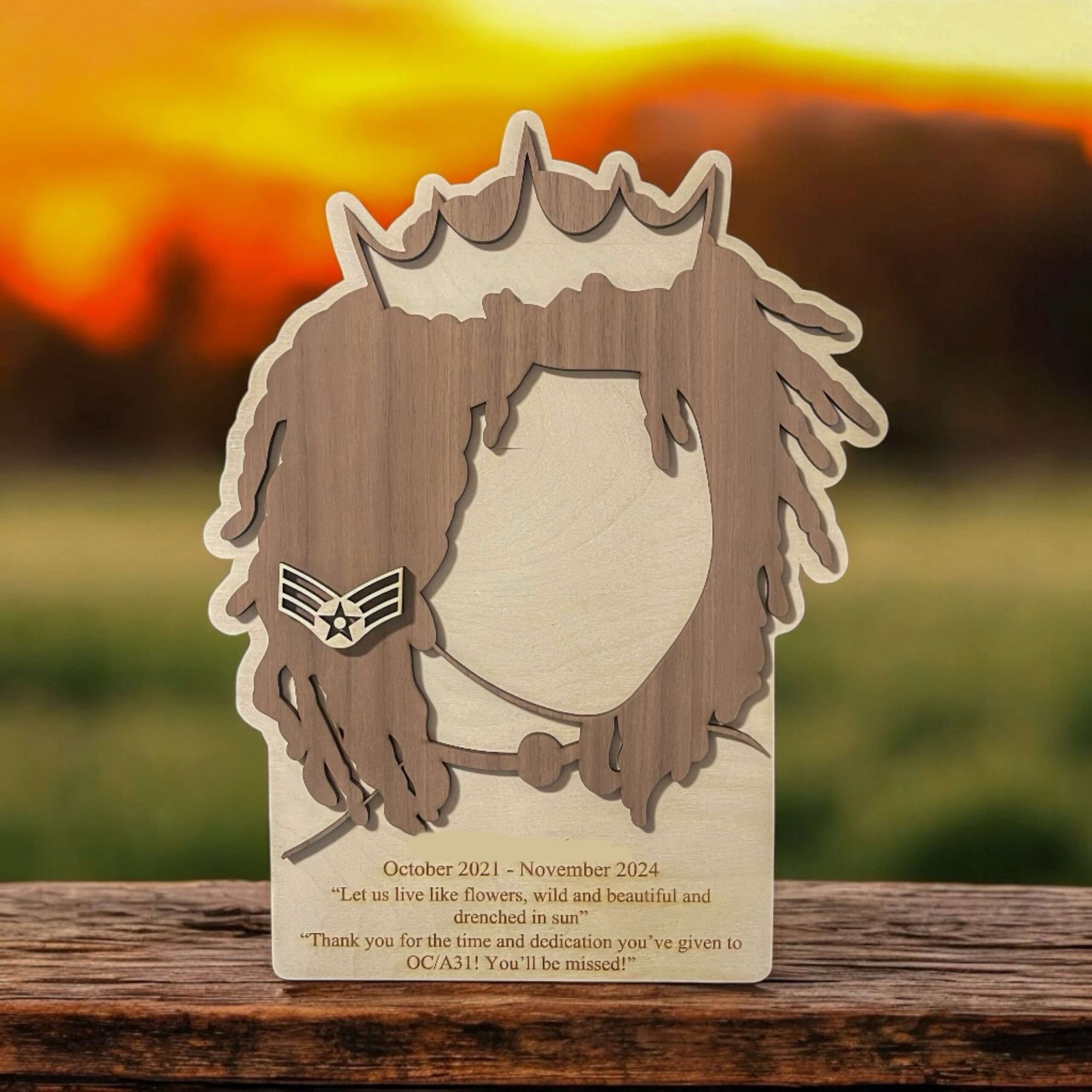 Celebrate Her Service & Authenticity Honor the remarkable woman in your life with a gift that speaks to her strength and identity. This custom layered wood plaque is designed specifically to celebrate African American female service members, featuring a striking profile with beautifully detailed natural locs and a Lady Liberty crown.