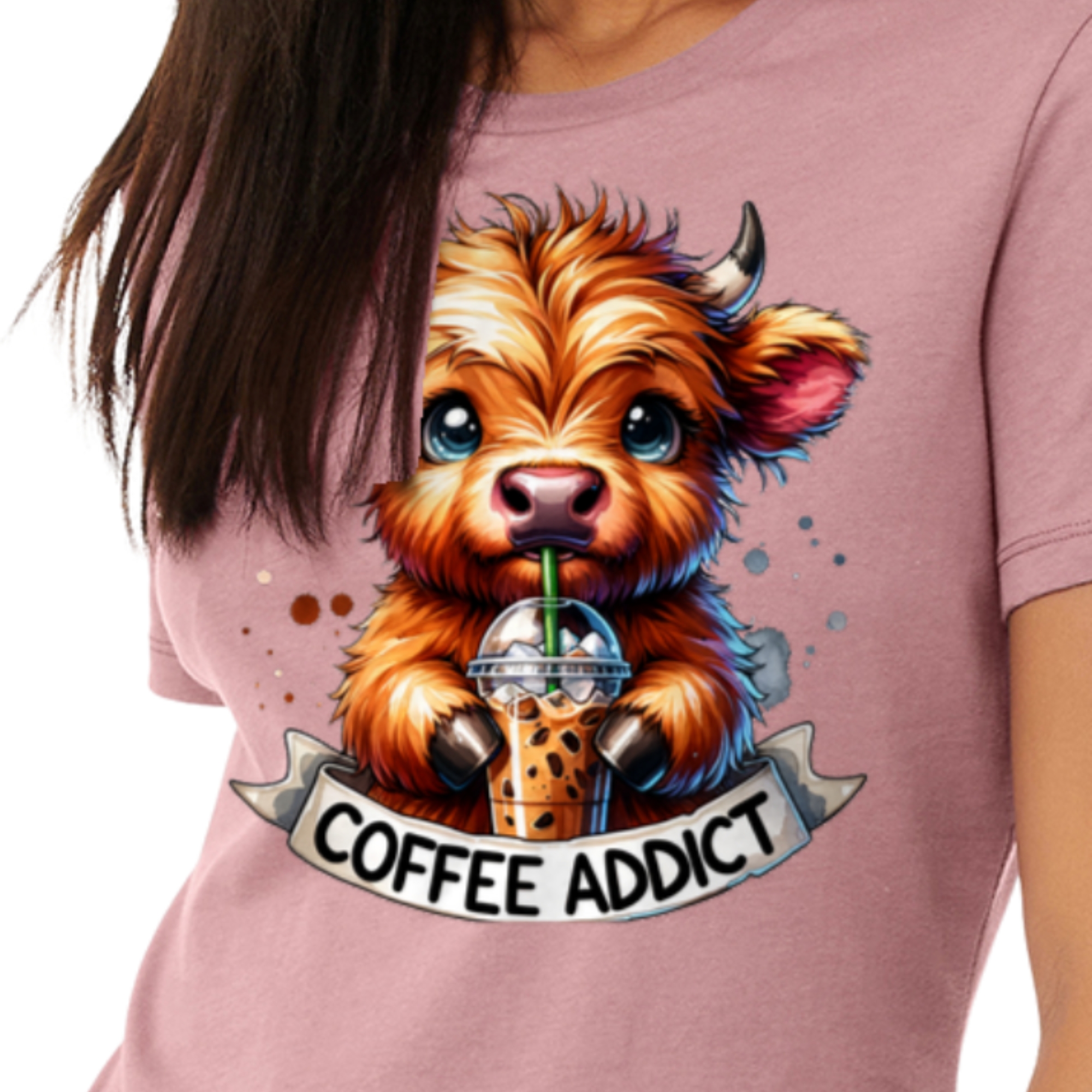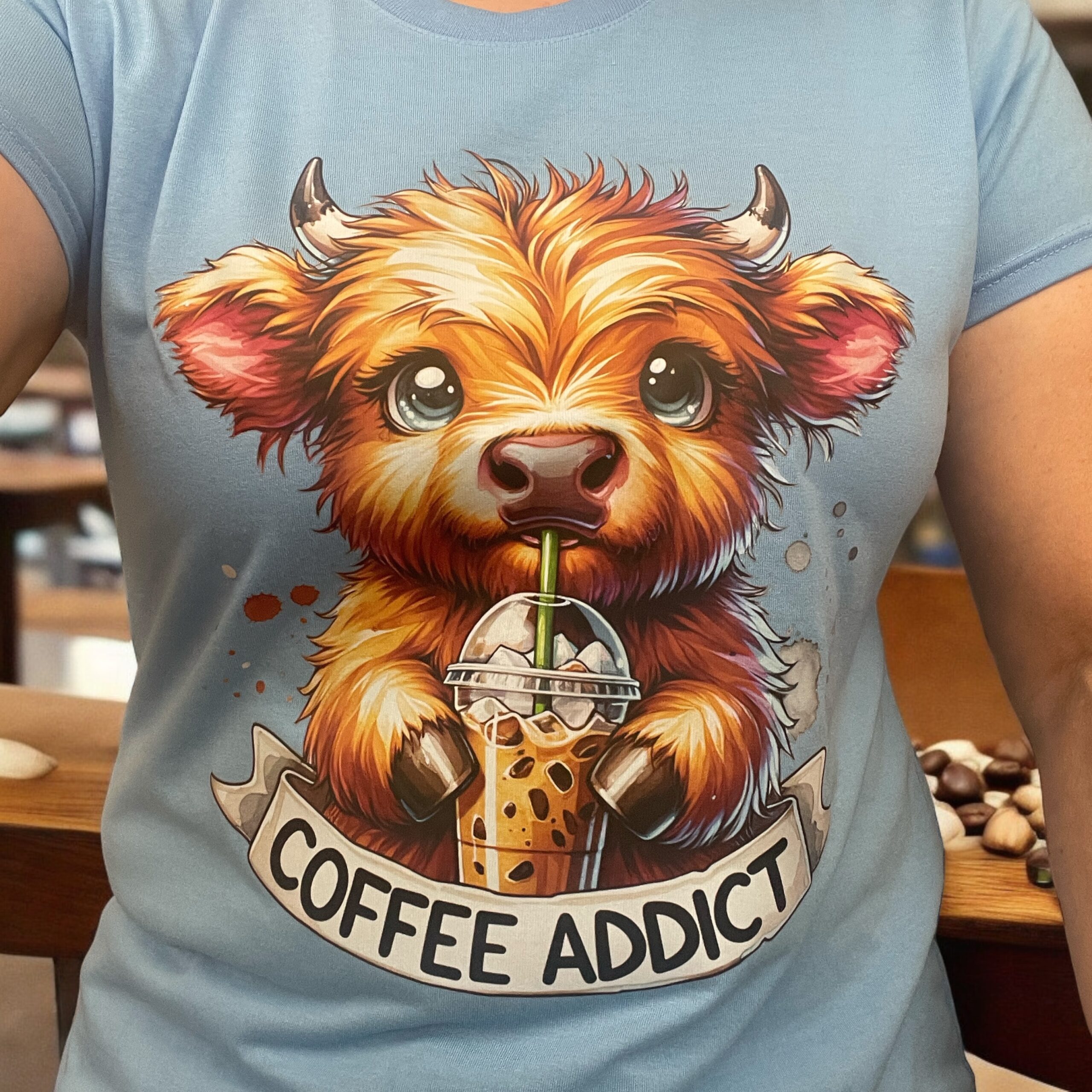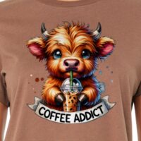 Adorable cow with a coffee addiction graces this tee. Perfect for coffee lovers and cow enthusiasts. Comfort meets cuteness!