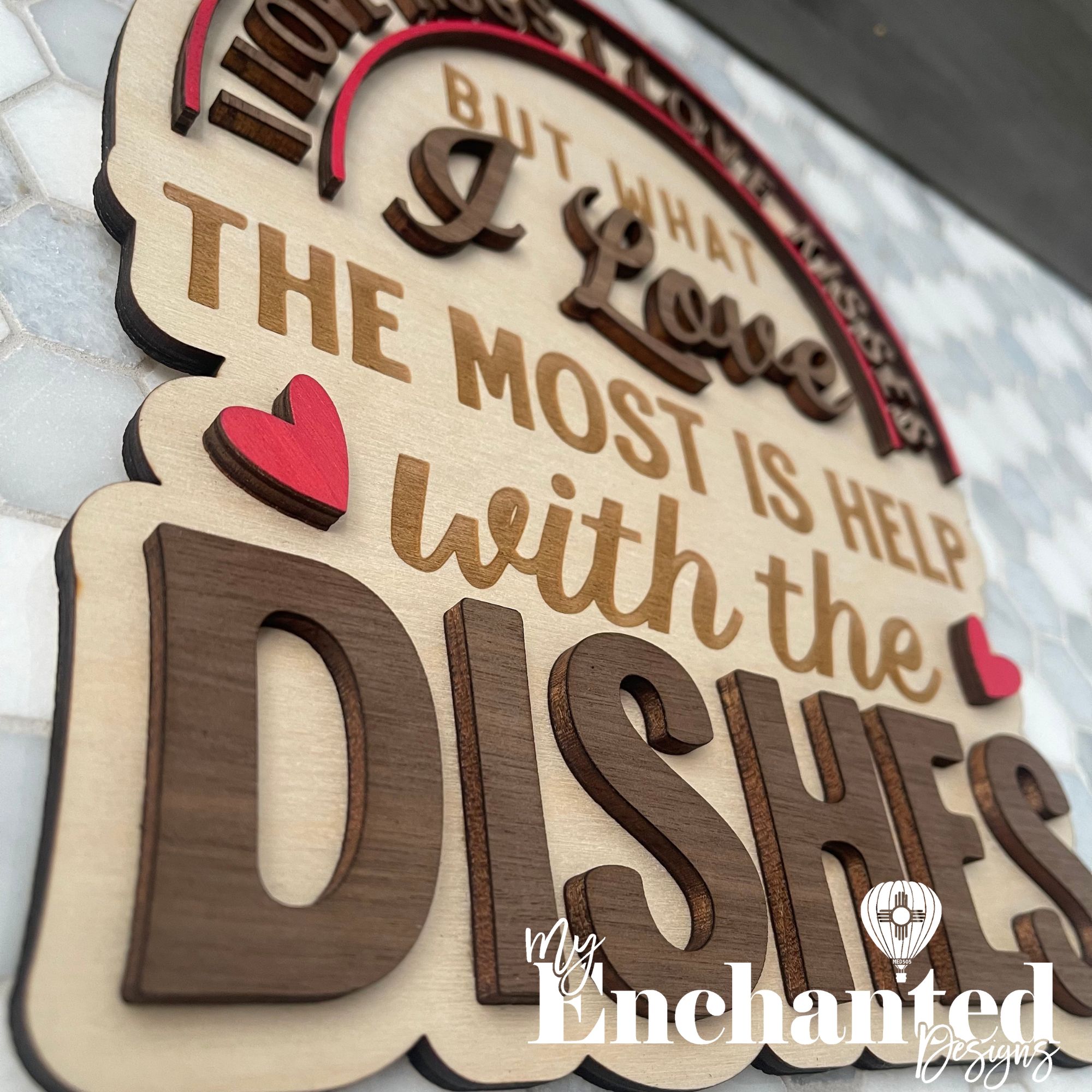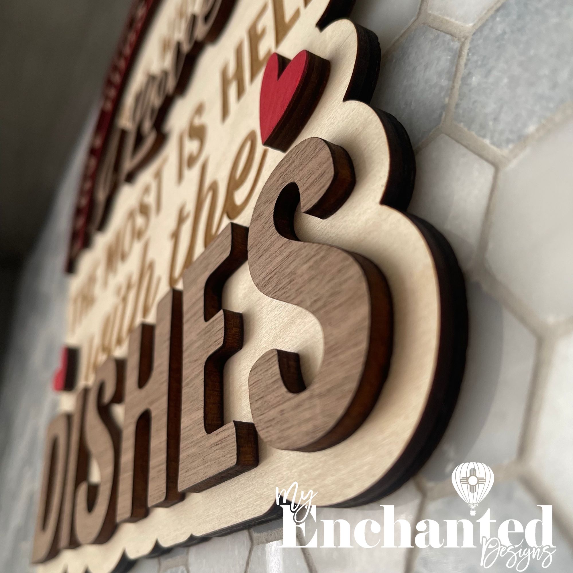 Materials: 1/4″ thick premium Birch & 1/4″ thick Walnut for letters and Heart & Half Circles cut from Birch.