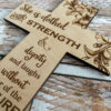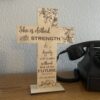 The cross can be placed on a wall with a 3M strip or left on its base for a table top setting. It can also be personalized with a name on the bottom portion of the cross slightly above the flowers.