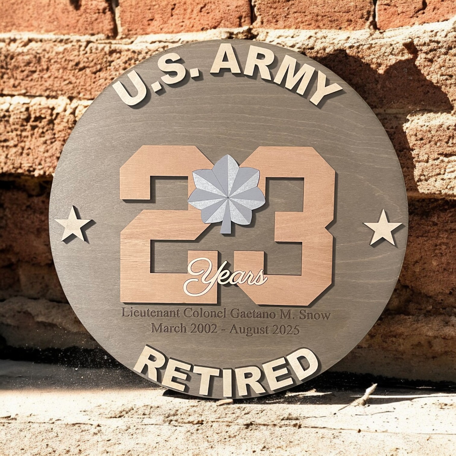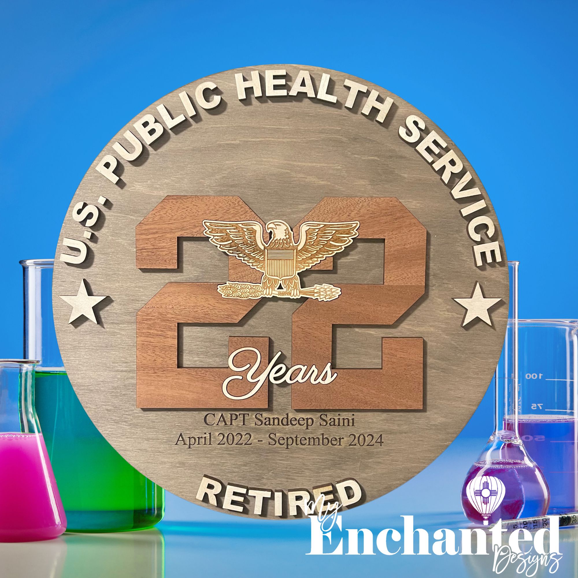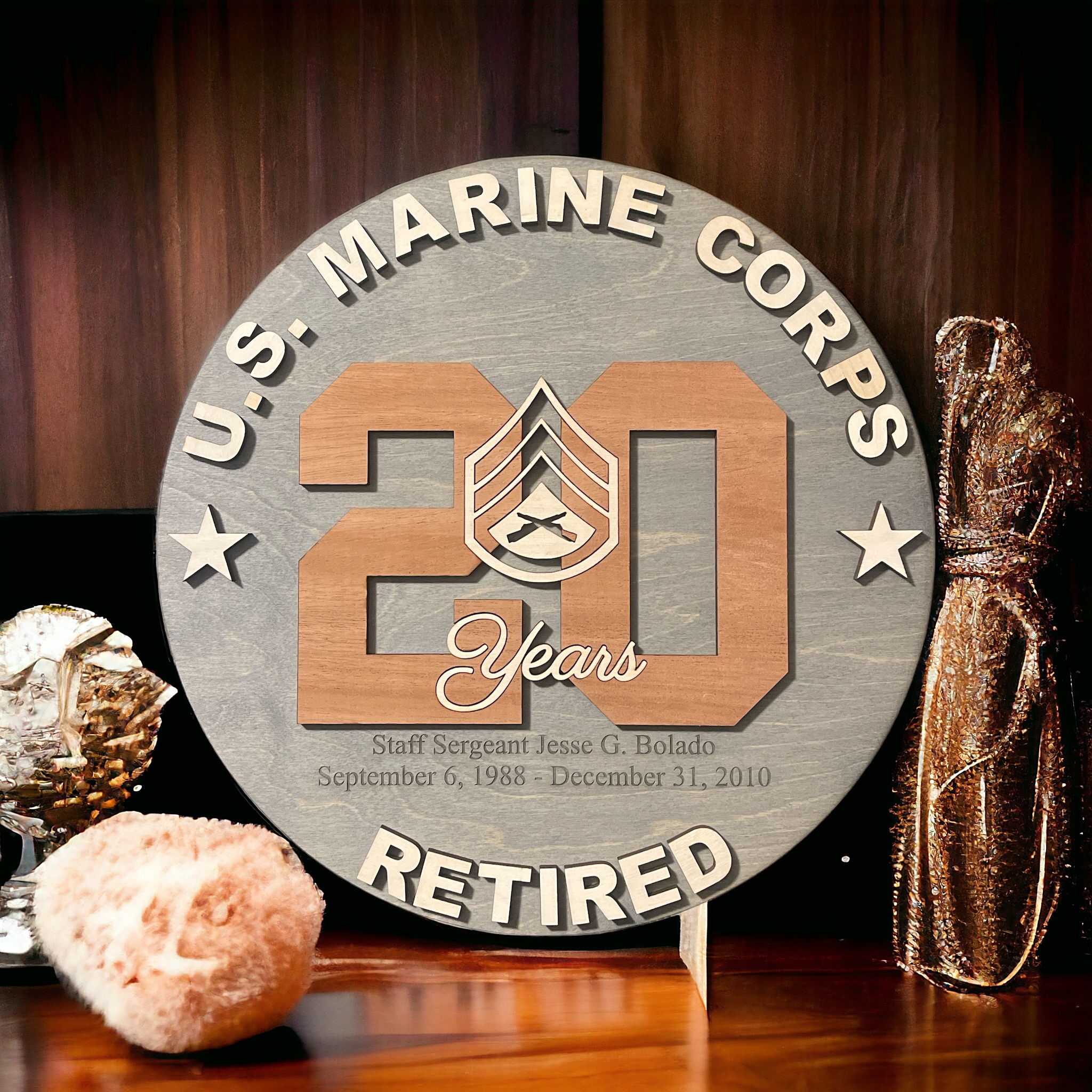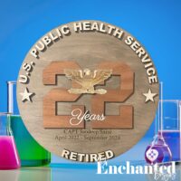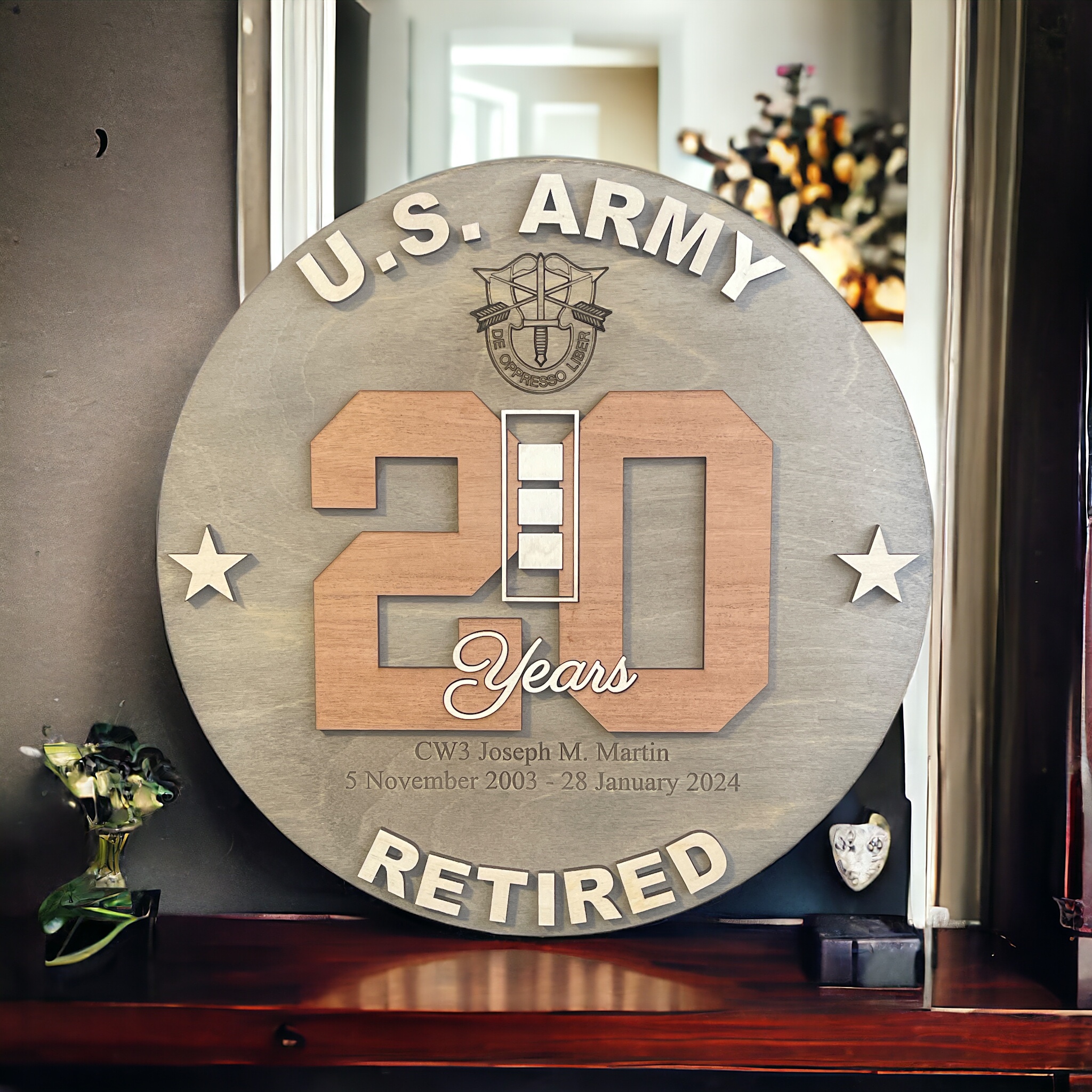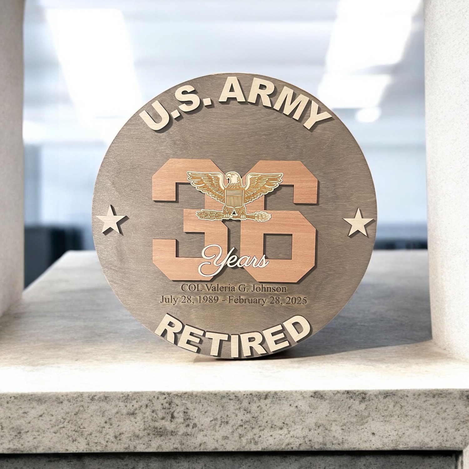Laser engraved & cut 14″, 16″ or 18″ round with military logo inlayed into number of years served. Wood used is 1/4″ premium Baltic Birch and 1/4″ Mahogany wood for the year.