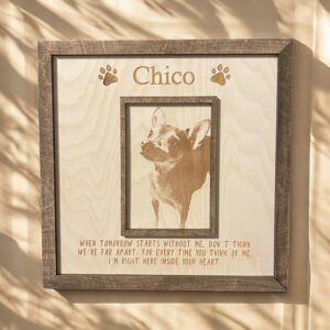 A pet frame will make a very touching pet loss gift. The frame measures 10″ x 10″ and is made with 1/4″ thick premium Baltic Birch. It is ready for wall hanging or tabletop display.