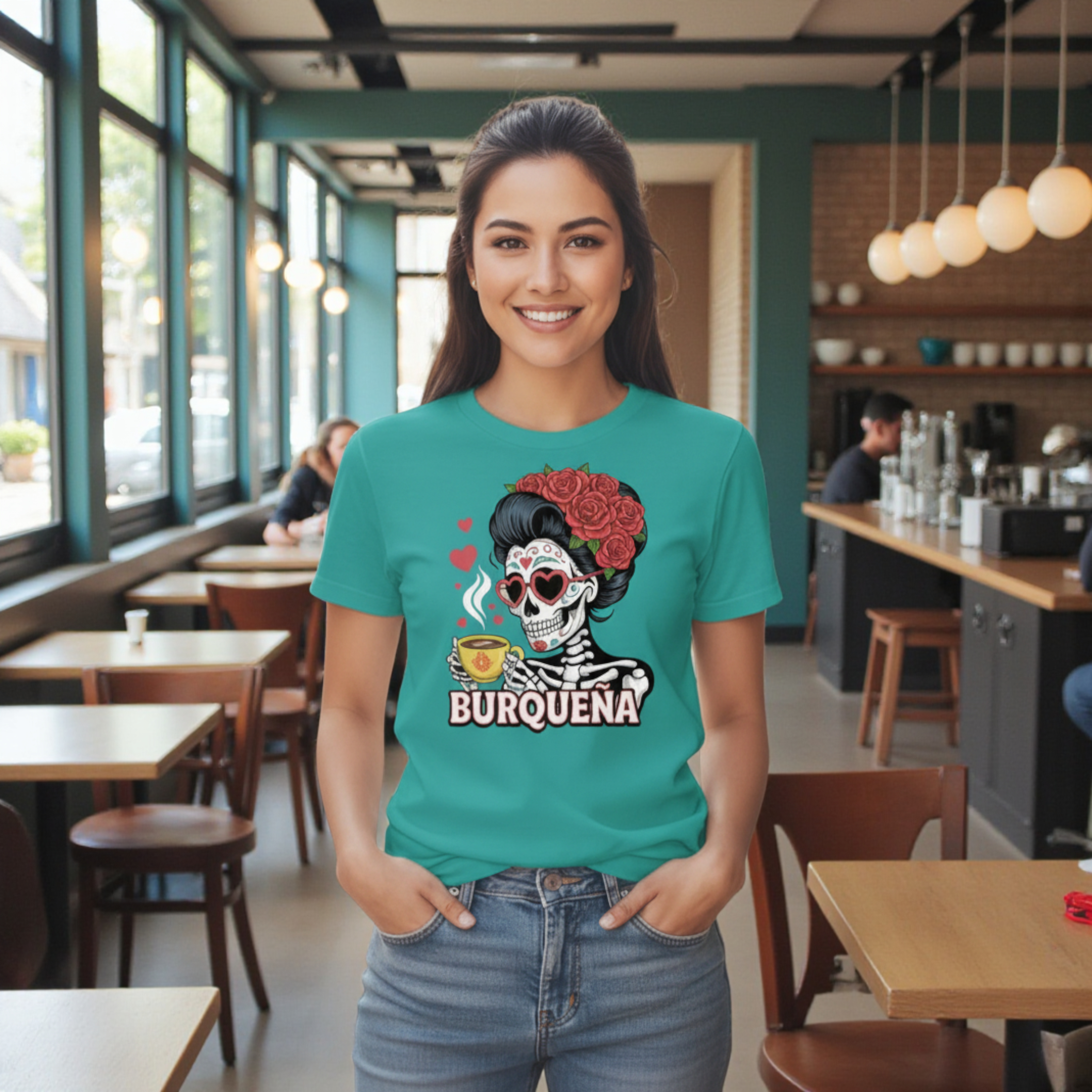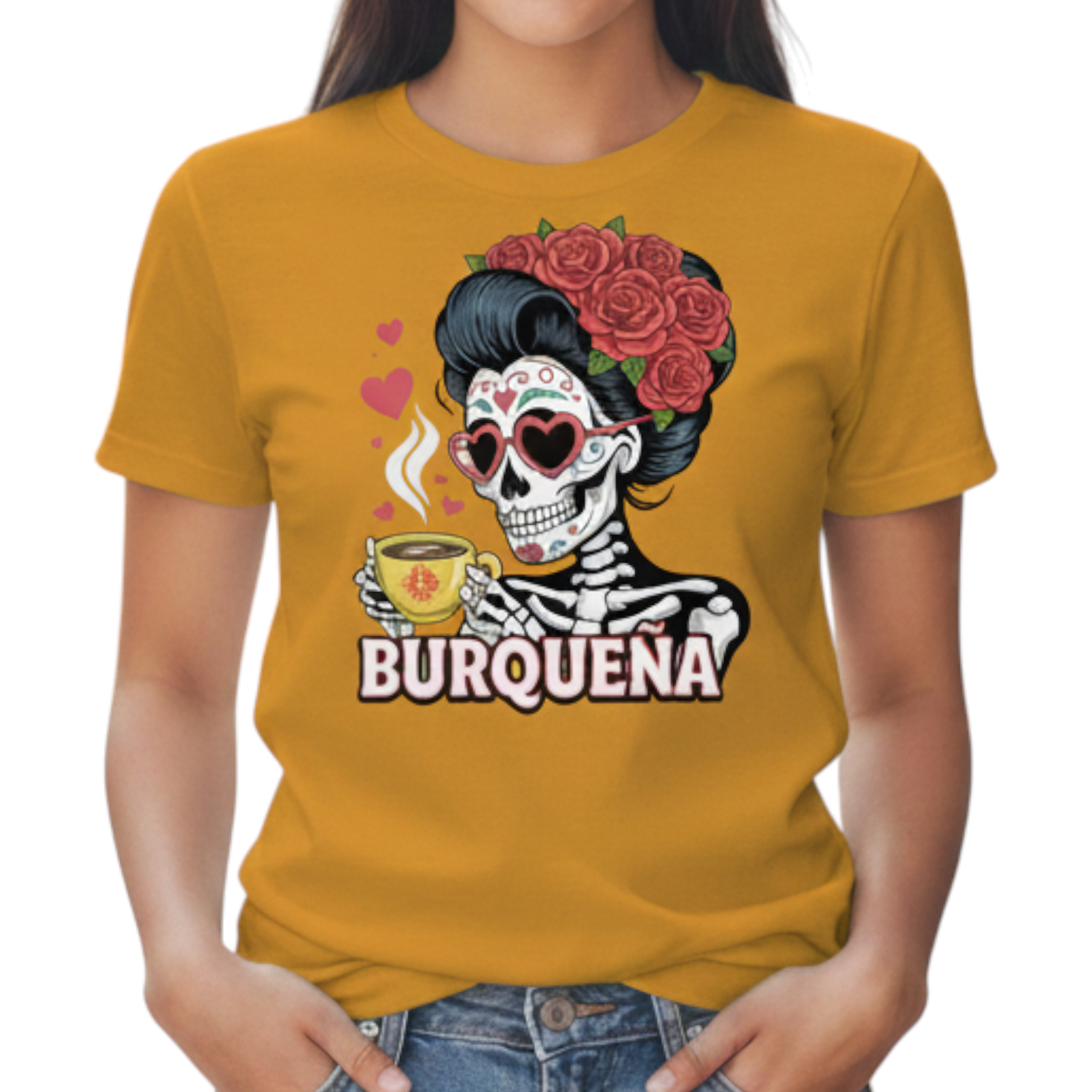 The Design: This vibrant graphic features a “La Catrina” style skeleton, adorned with classic red roses and heart-shaped sunglasses. She is holding a steaming cup of coffee featuring the iconic New Mexico Zia symbol, with the text “BURQUEÑA” (a woman from Burque/Albuquerque) boldly displayed below. It’s the perfect mix of spooky, cute, and local pride.