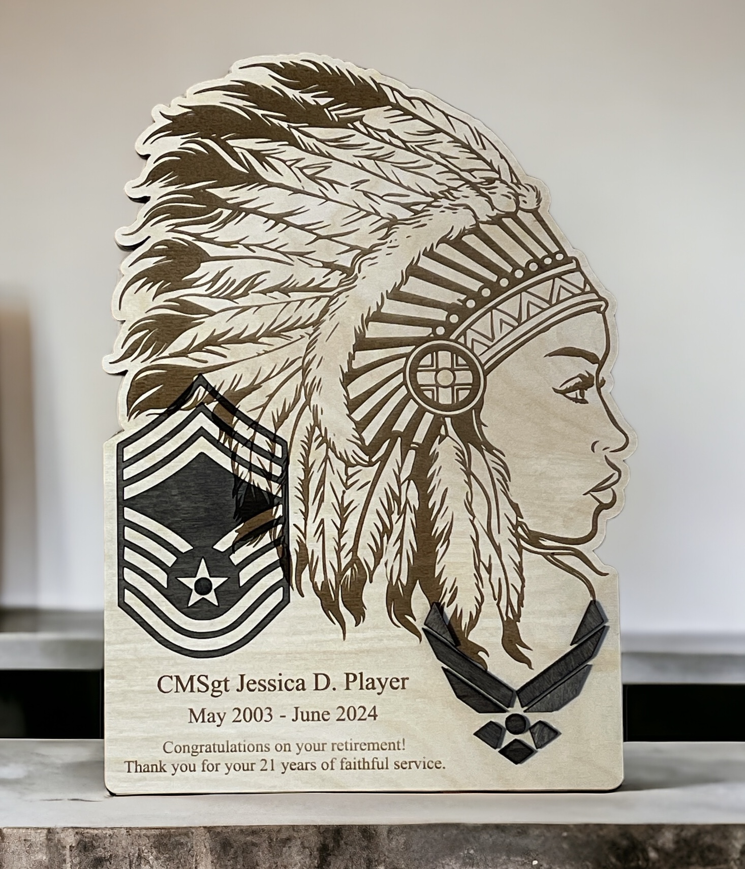 Chief rank is inlayed into plaque with the USAF logo raised above plaque and is stained with Pine Weather Wash stain.